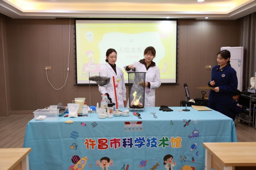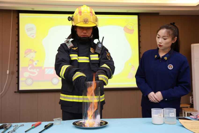活动现场,五大趣味科学实验依次登场,瞬间点燃氛围。彩色火龙卷腾空而起,引得学生阵阵惊叹;面粉粉尘遇火骤然爆炸,让大家真切感受火灾隐患的强大威力。小苏打白醋灭火、烟囱效应模拟等实验,让学生直观掌握防火逃生实用技巧,科技馆辅导员现场拆解科学原理,消防员同步讲解消防知识,实现科学与安全知识深度交融。