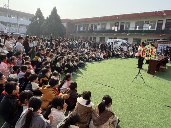 在禹州市古城镇明德学校,许昌市科技馆的科技辅导员为师生们带来了《角动量守恒之谜》趣味科学实验秀。辅导员通过“百变开花球”“转速之变”等一系列简单而精彩的实验演示,将复杂的科学原理生动呈现,引导学生关注身边的科学现象,启发科学思维,点燃科学热情。