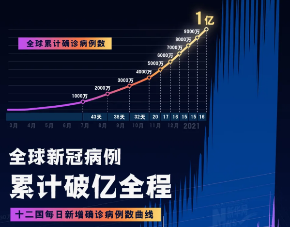 据美国约翰斯·霍普金斯大学全球疫情实时监测系统显示,截至北京时间1月27日6时23分,全球累计新冠肺炎确诊病例超一亿例,达100164399例,累计死亡病例达2153477例。来源:参考