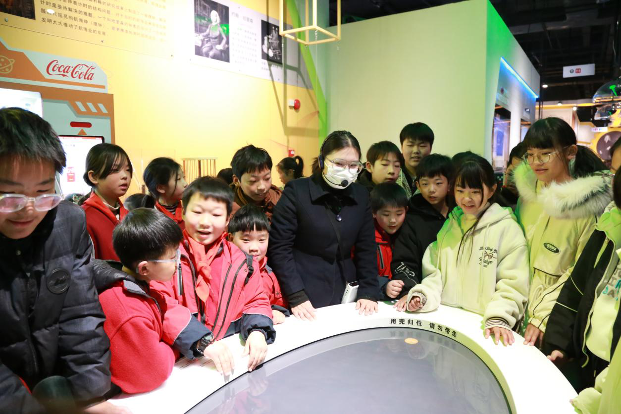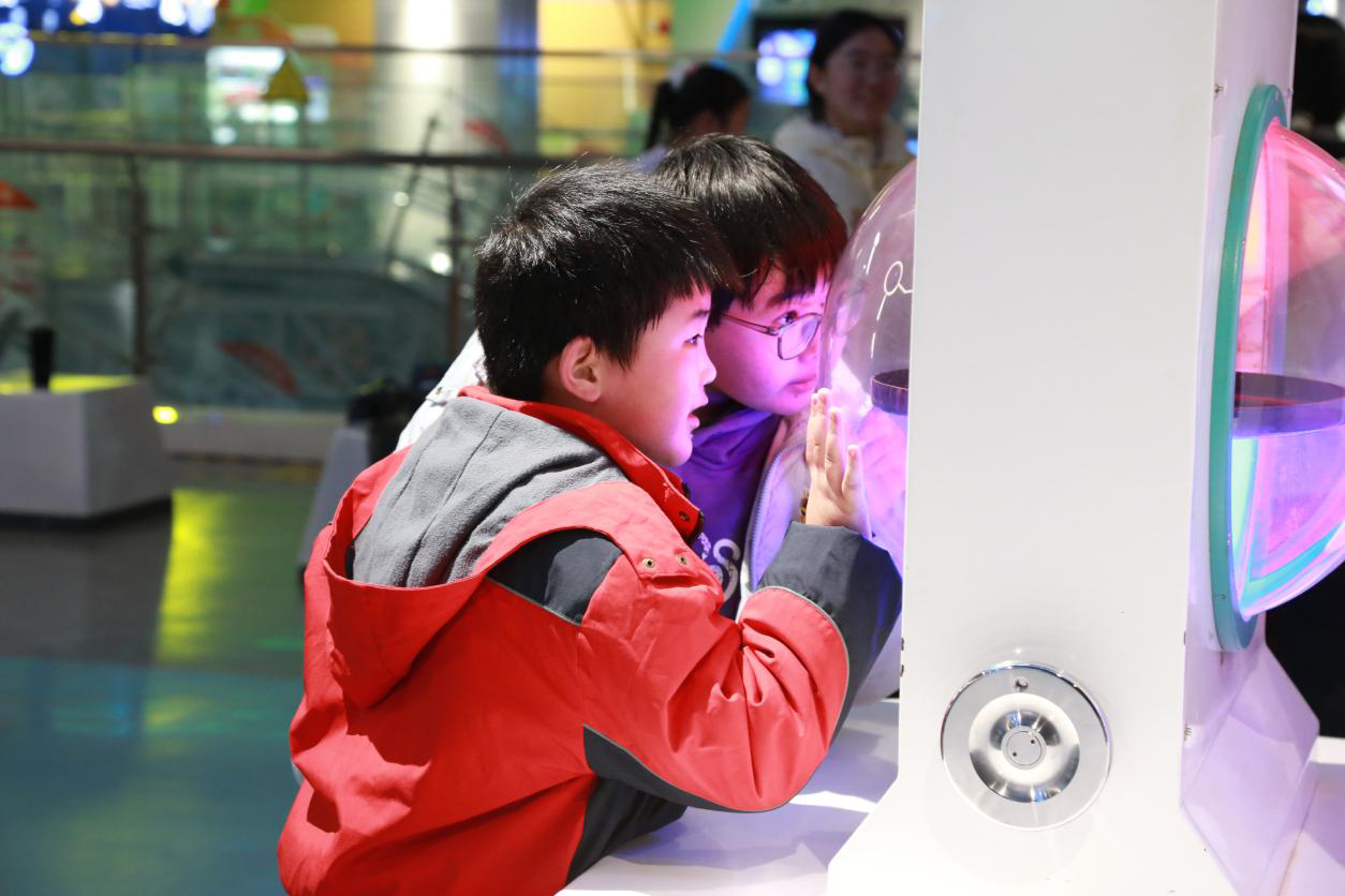 活动现场,标志性展项“科技之门”直观呈现科技发展迭代历程,迅速点燃孩子们的探索热情。在科技辅导员的引导下,师生分为两组走进不同展区,通过聆听讲解、亲手操作展品展项,感受光的折射与色散、电的奇妙反应,再到生命的演化奇迹、宇宙的浩瀚无垠,在“看、听、摸、思”多维体验中答疑解惑,拓宽科学视野、掌握科学知识。