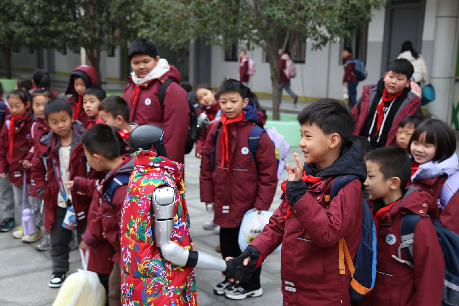 一大早,许昌市科技馆的“明星展品”——人形机器人与机器狗便已抵达校园,化身为最酷的“迎宾员”。人形机器人整齐列队,随着动感节拍翩然起舞,灵活多变的机器狗穿梭在入校的人流中,时而作揖问好,时而翻滚卖萌,引得刚刚返校的孩子们纷纷驻足围观、欢呼雀跃。