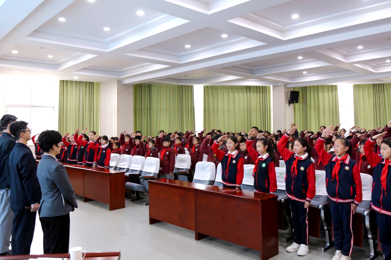和平校区的迎新现场同样热度不减,机器狗准时在校门口“上岗迎宾”,其憨态可掬的形象迅速成为当日“人气王”。本次活动的“重头戏”在和平校区三楼礼堂拉开帷幕,来自四年级的200余名学生代表齐聚一堂。许昌市科技馆精心策划的科普剧《苍穹筑梦人 致敬孙家栋》震撼上演。表演人员生动演绎了“两弹一星”元勋孙家栋院士从研制“东方红一号”到建设“北斗导航”,再到探月工程的传奇一生。“国家需要,我就去做”的誓言响彻礼堂,学生们被老一辈科学家胸怀祖国、勇攀高峰的精神深深打动,现场多次响起经久不息的掌声。