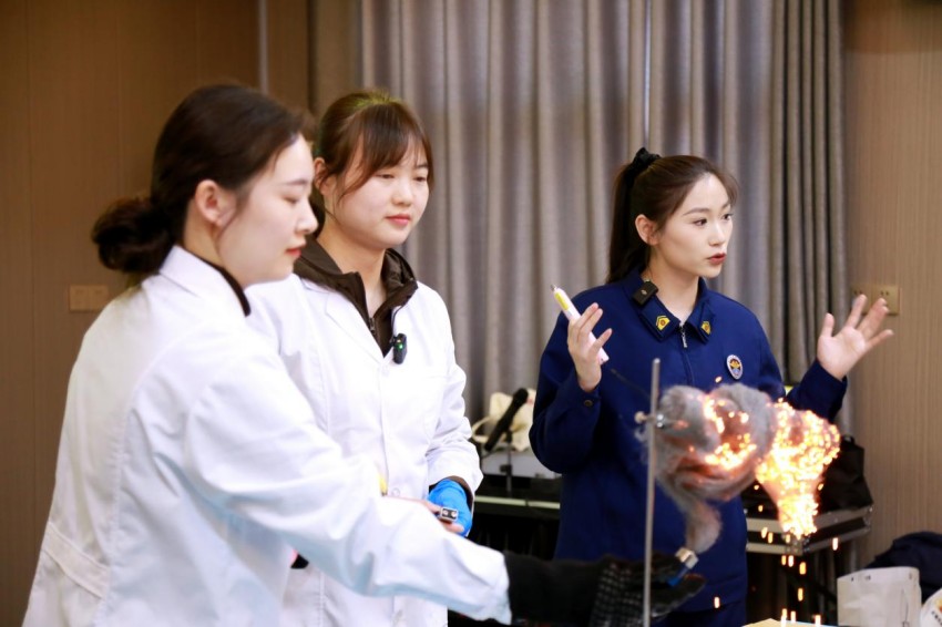 活动现场,五大趣味科学实验依次登场,瞬间点燃氛围。彩色火龙卷腾空而起,引得学生阵阵惊叹;面粉粉尘遇火骤然爆炸,让大家真切感受火灾隐患的强大威力。小苏打白醋灭火、烟囱效应模拟等实验,让学生直观掌握防火逃生实用技巧,科技馆辅导员现场拆解科学原理,消防员同步讲解消防知识,实现科学与安全知识深度交融。