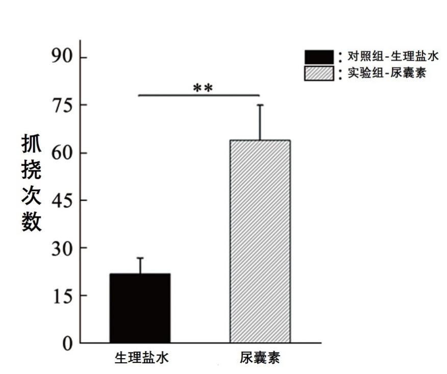 注射尿囊素的小鼠抓挠次数明显要比对照组的次数多很多,这表明尿囊素可以引发小鼠的瘙痒。
